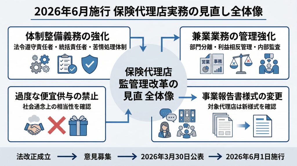 2026年3月30日に金融庁が公表したパブリックコメント関連資料は、保険代理店にとって「一部の大規模代理店だけの話」とは言い切れない内容でした。今回の公表では、特定大規模乗合保険募集人や特定大規模乗合損害保険代理店に対する体制整備の強化、保険会社側の管理強化、過度な便宜供与の禁止、事業報告書様式の見直しなどがまとめて示されています。ぱっと見ると資料が多くて少し身構えますが、実務で見たい論点はある程度整理できます。この記事では、2026年3月30日公表の資料をもとに、保険代理店に何が起きるのかをできるだけかみ砕いて整理します。 金融庁「令和7年保険業法改正に係る内閣府令等の公布及びパブリックコメント結果の公表について」