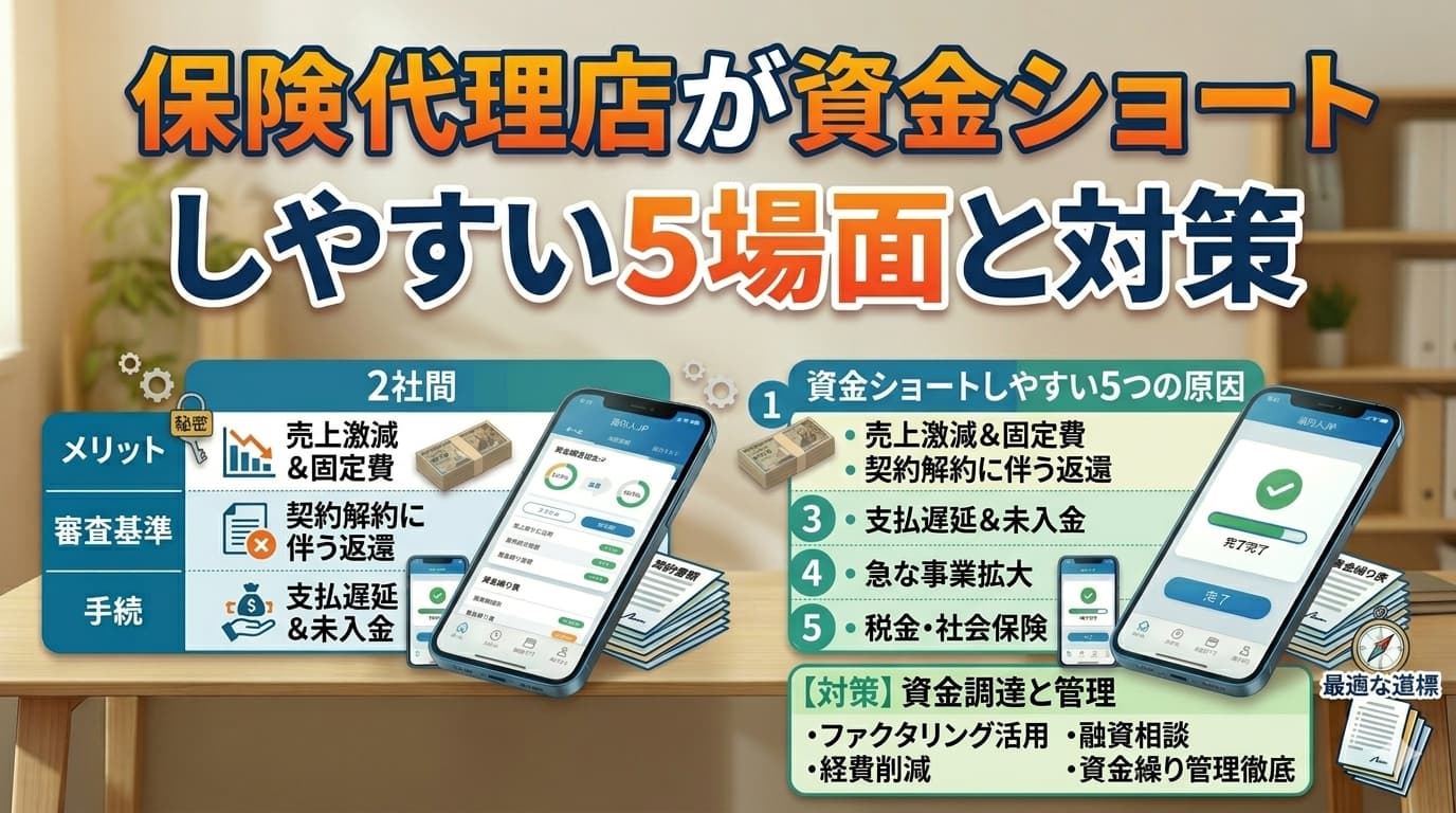 こうした場面では、調達手段を急いで探す前に、「何が遅れ」「何が先に出ていくのか」を切り分けるだけでも見え方が変わります。この記事では、保険代理店で資金ショートにつながりやすい5つの場面を整理しながら、社内で見直したい順番、公的制度の見方、ファクタリングに触れるときの注意点までまとめます。